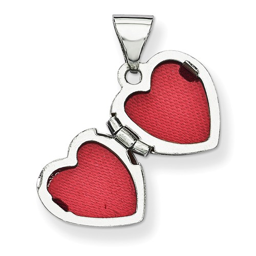 14kt white gold heart shaped locket has a floral design. This polished locket holds two photos. Dimensions: 10mm x 10mm. This item is half the size of a nickel. Weight: 0.34 grams. Import.