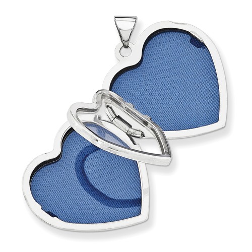 14k white gold heart locket has a smooth finish and flat center. Polished finish locket holds three photos. Dimensions: 21mm x 21mm. This item is the size of a nickel. Weight: 2.2 grams. Import.