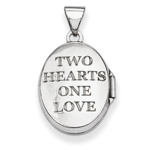 14k white gold oval locket has two hearts in the center. Polished finish locket holds two photos. The back of the locket has the engraving: TWO HEARTS ONE LOVE. Dimensions: 17mm x 13mm. This item is slightly smaller than a dime. Weight: .7 grams. Import.