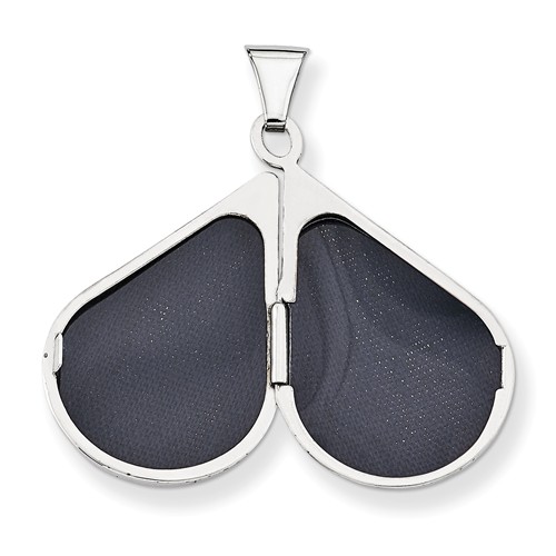 14k white gold tear drop shaped locket has a diamond accent and holds two photos. Dimensions: 21mm x 14mm. This item is the size of a nickel. Weight: 1.0 gram. Import.