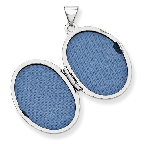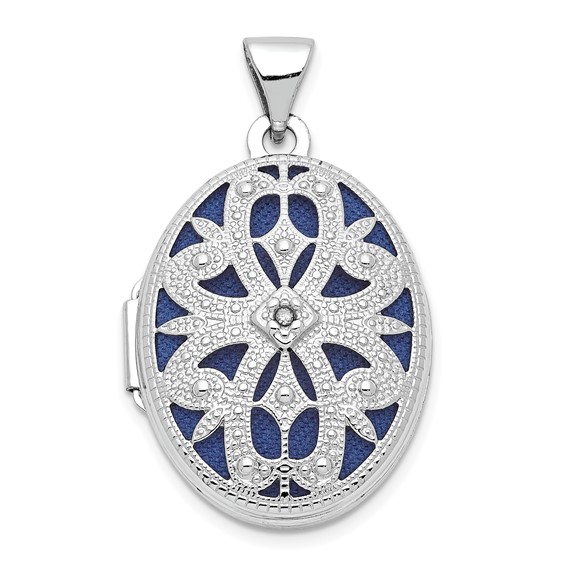 14k white gold open filigree locket has a 1/2pt diamond accent and holds one photo. Dimensions: 21mm x 15mm. This item is the size of a nickel. Weight: 1.8 grams. Import.