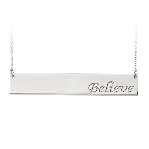 Sterling silver bar necklace is engraved with the word Believe on the right side. Sterling silver adjustable 16 to 18in diamond cut cable chain and lobster clasp. Pendant dimensions: 1 1/4in x 1/4in. Weight: 2.6 grams. Import.