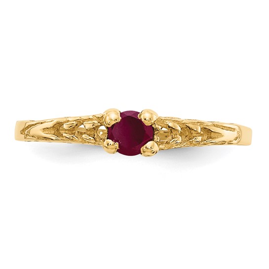 Madi K 3mm ruby birthstone baby ring is made of 14kt yellow gold. Size 3 only. Made in the USA.