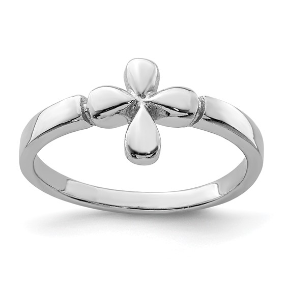 Rhodium plated sterling silver child's polished cross ring. Item size: 1/4in x 1/4in. Import.