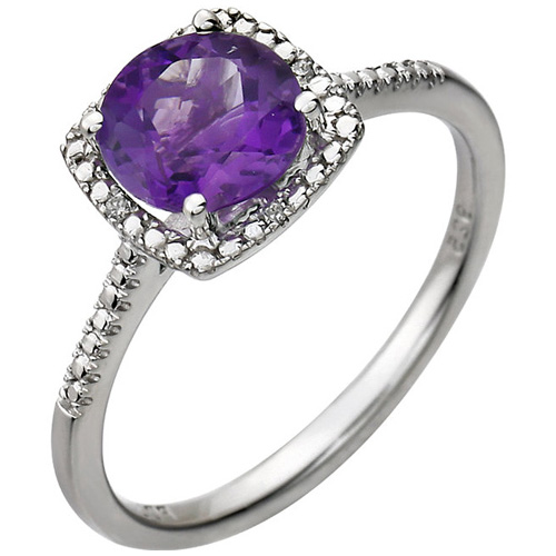 Sterling silver halo style ring features one 7mm round amethyst and .01 ct tw diamond accents. Pair with matching necklace JJ650182BT and earrings JJ650167BT. Diamond details: 4 x 0.003 ct, .8mm, H color and I3 clarity. Item weight: 1.8 grams.