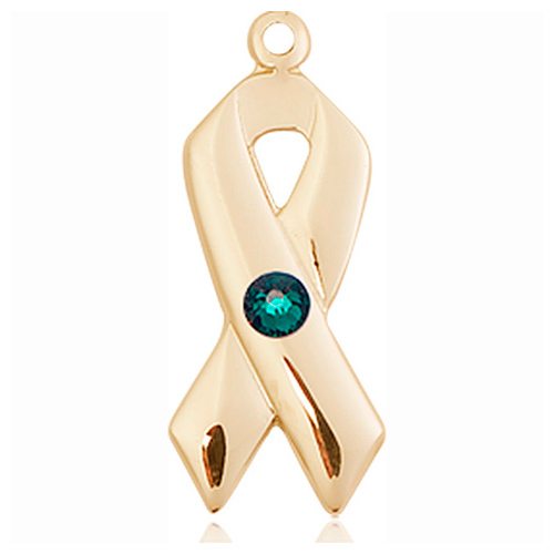 14kt yellow gold cancer awareness ribbon pendant with 3mm emerald Swarovski bead. Dimensions: 7/8in x 3/8in. Made in USA.