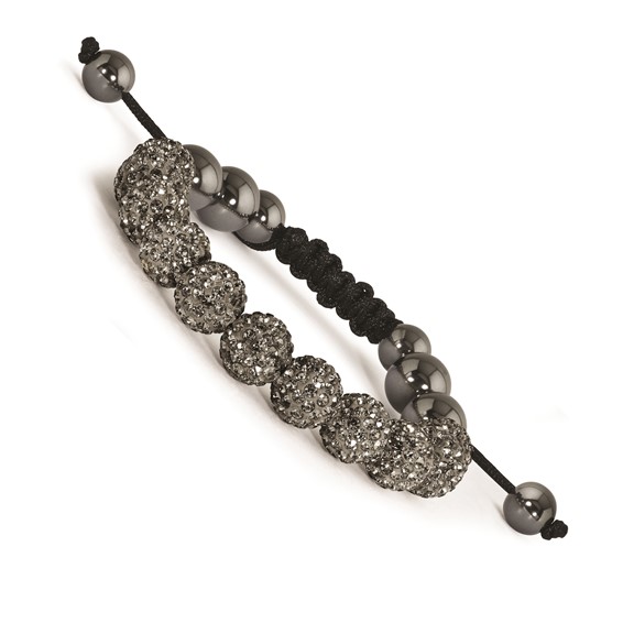 10mm grey crystal & hematite beads black cord bracelet. The beads are 10mm. One size fits most. This slip-on, adjustable bracelet is part of our Spotlight Macrame Collection.