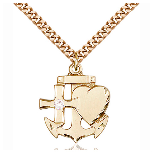 Gold filled faith, hope and charity pendant with 3mm crystal Swarovski bead. Dimensions: 7/8in x 3/4in. 24-inch stainless steel, endless heavy curb chain with gold plating.Made in USA.