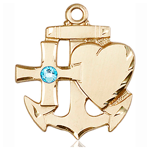 14kt yellow gold faith, hope and charity medal with 3mm aqua Swarovski bead. Dimensions: 7/8in x 3/4in. Made in USA.