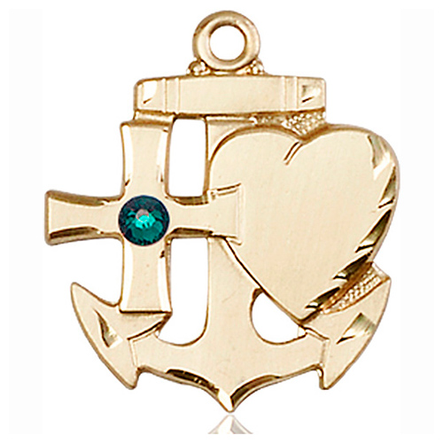14kt yellow gold faith, hope and charity medal with 3mm emerald Swarovski bead. Dimensions: 7/8in x 3/4in. Made in USA.