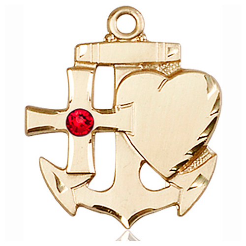 14kt yellow gold faith, hope and charity medal with 3mm ruby Swarovski bead. Dimensions: 7/8in x 3/4in. Made in USA.