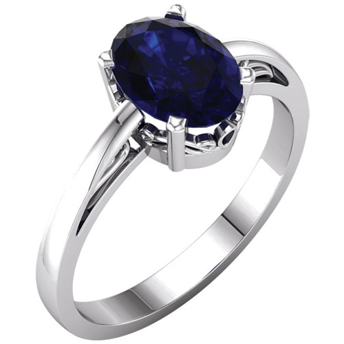 14kt white gold ring features a 1.75 ct oval Chatham created blue sapphire and scroll design. Gemstone details: 8mm x 6mm, gem quality. Weight: 1.9 grams. Please note: weight is approximate, actual weight may vary.