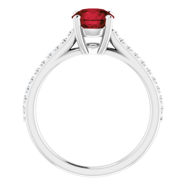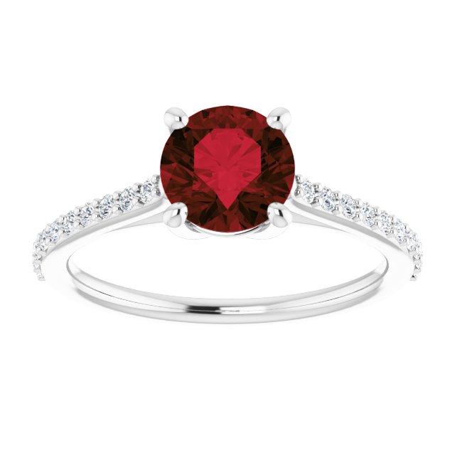 14kt white gold ring features a 1.35 ct genuine round garnet with 20 diamond accents. Garnet details: 6.5mm, AA quality. .20 ct tw diamond accents, 20 x 1.3mm, full cut, G-H color, SI2-SI3 clarity. Weight: 2.5 grams. Made in the USA. Please note: weight is approximate, actual weight may vary.