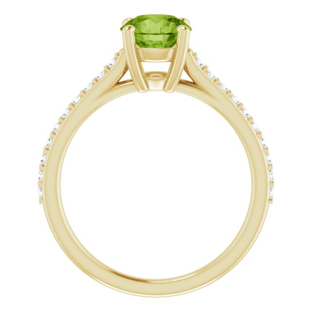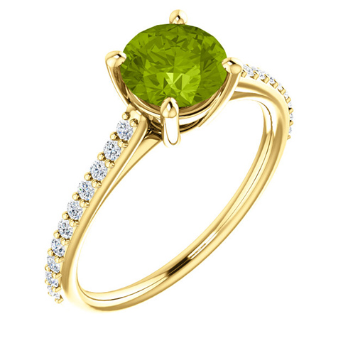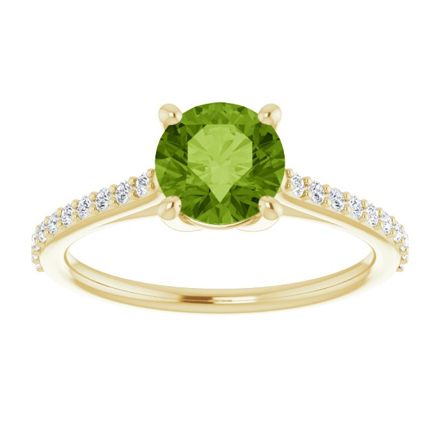 14kt yellow gold ring features a 1.25 ct genuine round peridot with 20 diamond accents. Peridot details: 6.5mm, AA quality. .20 ct tw diamond accents, 20 x 1.3mm, full cut, G-H color, SI2-SI3 clarity. Weight: 2.5 grams. Made in the USA. Please note: weight is approximate, actual weight may vary.