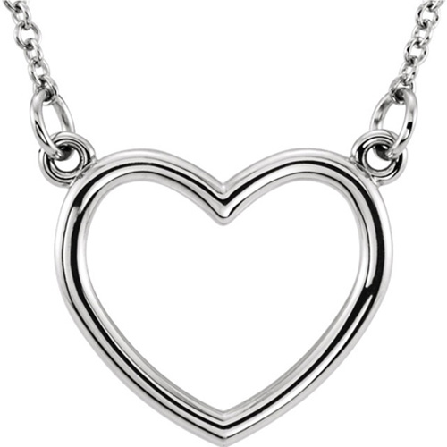 Polished 14kt white gold open heart pendant dangles from a matching 16in cable chain. Pendant dimensions: 13mm x 13.75mm. Chain width: 1mm. Spring ring clasp. Approximate weight: 2.2 grams. Made in the USA.