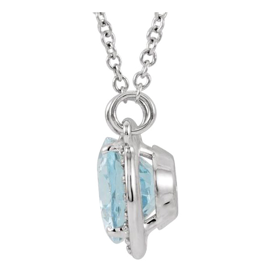 9mm x 7mm oval aquamarine and diamonds halo pendant dangles from a 14kt white gold 16in cable chain. Gemstone details: genuine faceted aquamarine, 1.75 carats, AA quality, .05 ct tw diamond accents. Item weight: 2.4 grams. Please note: weight is approximate, actual weight may vary.