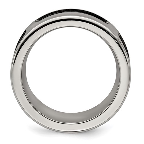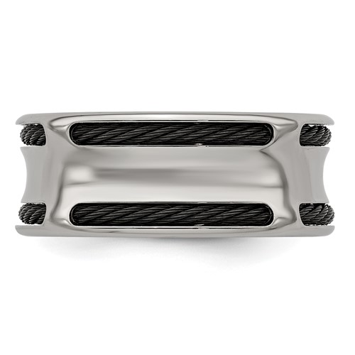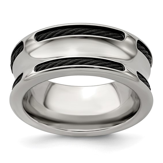 Titanium concave ring features black stainless steel cables. Ring width: 10mm. Comfort fit. This ring is 100% hypo-allergenic. Made in the USA by Edward Mirell, the leader in contemporary men's jewelry. Enjoy the manufacturer's lifetime limited warranty.