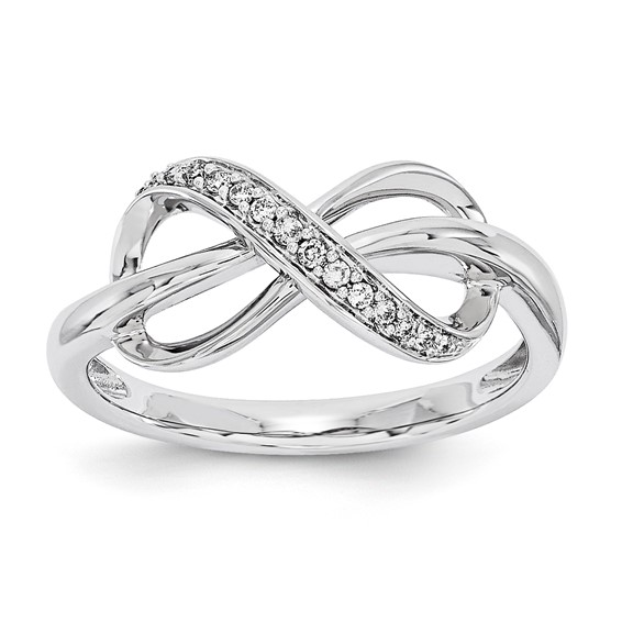 Sparkling diamonds are set in this infinity shape 14kt white gold promise ring. Diamond details: 0.08 ct tw, I1 clarity, H-I color. Weight: 3.0 grams. Import.