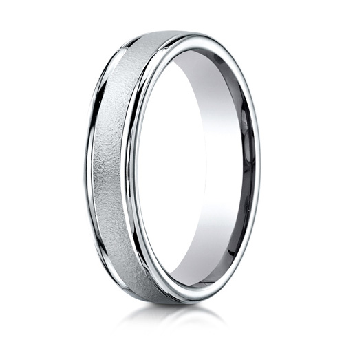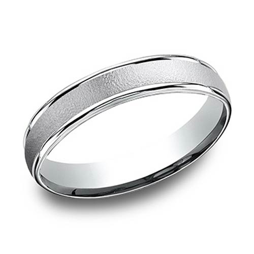 Comfort fit platinum wedding band has a wire brush domed center and polished rounded edges. Width: 4mm. Solid platinum 950 [95% Platinum, 5% Ruthenium alloy] Made in USA.