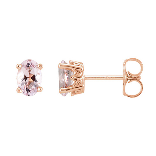 14kt rose gold .50 ct tw oval morganite stud earrings are set in a scroll design. Gemstone details: 5mm x 3mm genuine morganite, .25 ct each, faceted AA quality. Weight: 0.78 grams. Please note: weight is approximate, actual weight may vary.