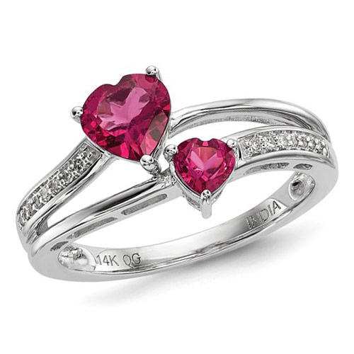 14k white gold 1 ct tw pink tourmaline ring has two hearts and a row of diamond accents. Diamond details: six full cut diamonds, .06 carat total weight. Pink tourmaline is eye clean with good cut. Approximate item weight: 3.8 grams. Import.