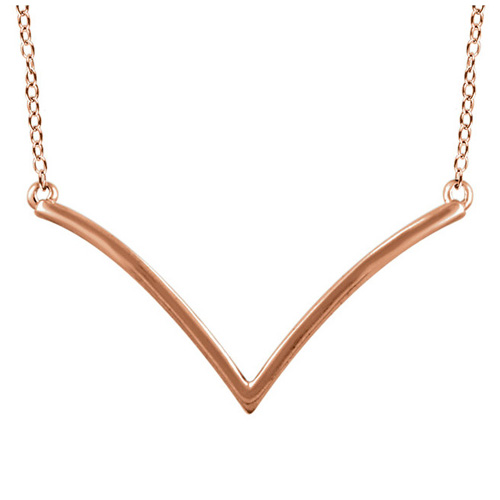 14kt rose gold V shaped pendant dangles from an 18in cable chain with spring ring clasp. Pendant size: 27.2mm x 12.75mm. The arrow is the size of a quarter. Chain width: 1mm. Item weight: 1.2 grams. Made in the USA.