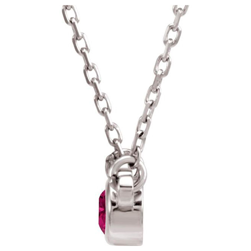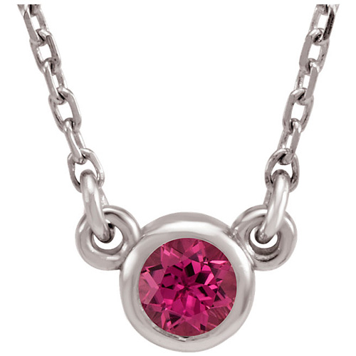 14kt white gold 1/4 carat round pink tourmaline bezel pendant dangles from a 14kt white gold 18in cable chain with spring ring clasp. Chain width: 1mm. Gemstone details: genuine round 4mm faceted pink tourmaline, AA quality. Item weight: 1.6 grams.