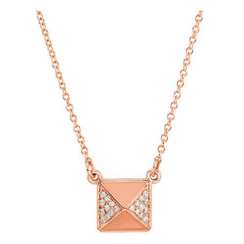 14k rose gold pyramid pendant has .05 carat total weight diamond accents. Pendant size: 10.75mm x 10.75mm. 14k rose gold 16in cable chain with spring ring clasp. Chain width: 1mm. Diamond details: 20 round full cut diamonds, I1 clarity, G-H color. Item weight: 2.1 grams.