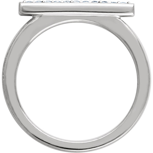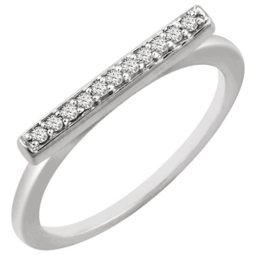 1/10 ct diamond bar ring is made of polished solid 14k white gold. Diamond details: 11 round diamonds, H color, I1 clarity. Ring top width: 2.6mm. Ring top length: 17mm. Ring palm width: 1.5mm. Item weight: 2.6 grams.