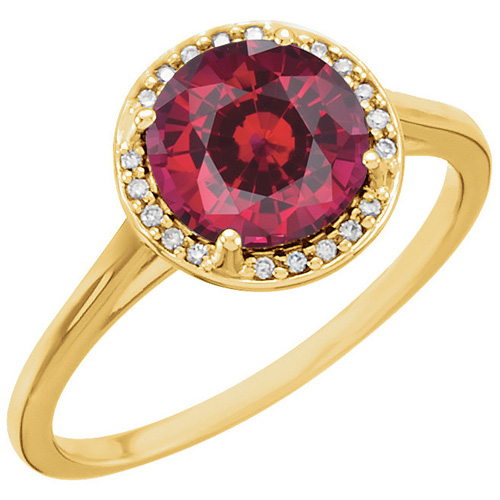 14kt yellow gold halo style ring features a 2.75 ct Chatham created round ruby and diamond accents. Ruby details: 8mm round faceted, gem quality. Diamond details: .05 carat total weight, 20 round full cut diamonds, G-H color, I1 clarity. Ring top width: 10.7mm. Ring palm width: 1.3mm. Item weight: 2.5 grams. Made in the USA. Please note: weight is approximate, actual weight may vary.