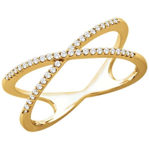 1/6 ct tw diamond cross over ring is made of polished 14kt yellow gold. Diamond details: 16 round diamonds, H color, I1 clarity. Ring top width: 6.5mm. Ring top length: 18.9mm. Ring palm width: 1.2mm. Item weight: 2.5 grams.