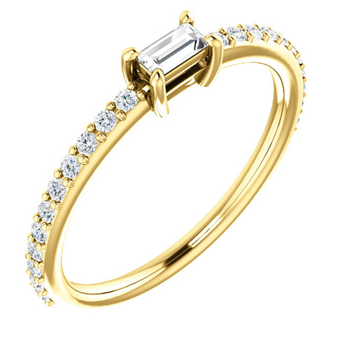 3/8 ct tw diamond stackable ring is made of polished 14kt yellow gold. 1 straight baguette diamond, 3.75mm x 2mm; 22 round diamonds, G-H color, SI2-SI3 clarity. Item weight: 2.1 grams.