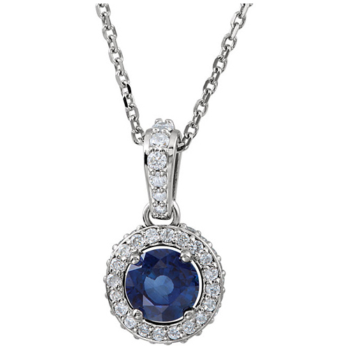 .70 ct round blue saphire and diamond necklace is set in polished 14kt white gold. 14kt white gold 18in loose rope chain and lobster clasp. Gemstone details: genuine 5mm round blue sapphire, AA quality. 48 full cut diamond accents, 0.25 ct tw, G-H color, I1 clarity. Pendant with bail: 15.2mm x 8.1mm. Weight: 2.4 grams. Please note: weight is approximate, actual weight may vary.