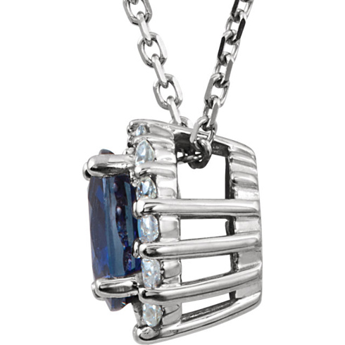 .70 ct oval blue saphire and diamond necklace is set in polished 14k white gold. 14k white gold 18in diamond-cut cable chain and spring ring clasp. Gemstone details: genuine 6mm x 4mm oval blue sapphire, AA quality. 15 full cut diamond accents, 0.16 ct tw, G-H color, I1 clarity. Pendant with bail: 8.5mm x 6.8mm. Weight: 1.9 grams. Please note: weight is approximate, actual weight may vary.