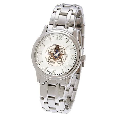 Bulova masonic watch has a 38mm stainless steel case and a polished and brushed bracelet. White round dial features a hour, minute and sweep second hands. G, compass and set square emblem in center. Fine quartz movement. Double-press fold-over clasp. Limited 1 year warranty.