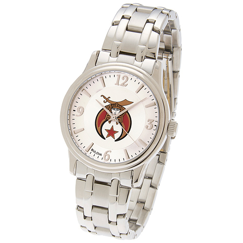 Bulova Shriners watch has a 38mm stainless steel case and a polished and brushed bracelet. White round dial features hour, minute and second hands. Scimitar emblem in the center. Silver Arabic and stick hour markers. Domed crystal. Fine quartz movement. Double-press fold-over clasp. Limited 1 year warranty.
