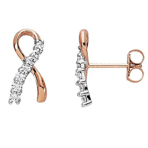 1/4 ct diamond ribbon earrings are made of polished solid 14k rose gold with rhodium plating. Diamond quality: SI3 clarity, G-H color, 14 full cut round diamonds. Earring size: 13mm x 6.75mm. Friction backs. Item weight: 1.1 grams. Made in the USA.