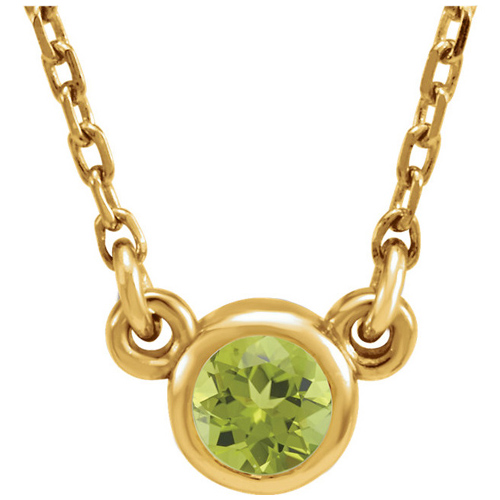 14kt yellow gold 1/4 carat round peridot bezel pendant dangles from a 14kt yellow gold 16in cable chain with spring ring clasp. Chain width: 1mm. Gemstone details: genuine round 4mm faceted peridot, AA quality. Item weight: 1.6 grams.