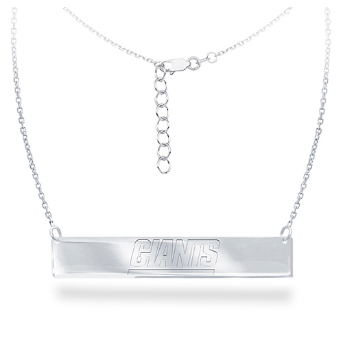Sterling silver New York Giants bar shaped necklace dangles from an adjustable 16 to 18in diamond cut cable chain with lobster clasp. Pendant dimensions: 1 3/8in x 1/4in. Weight: 2.7 grams. Officially licensed. Import.