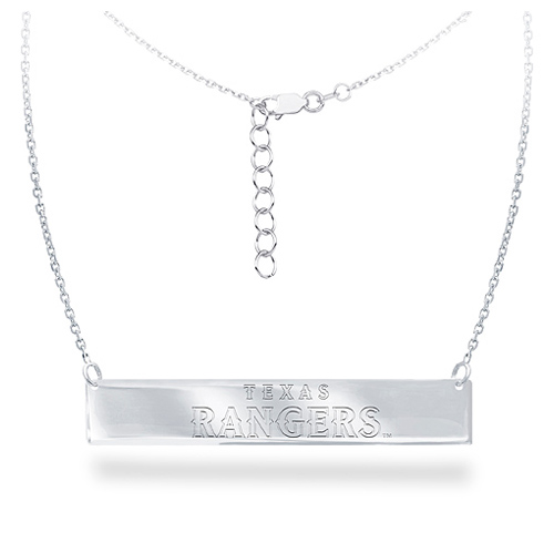 Sterling silver Texas Rangers bar shaped necklace dangles from an adjustable 16 to 18in diamond cut cable chain with lobster clasp. Pendant dimensions: 1 3/8in x 1/4in. Weight: 2.7 grams. Officially licensed. Import.