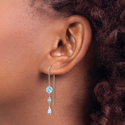 Round and pear shaped Swiss blue topaz threader earrings are made of solid 14k white gold. Earring length: 1 3/4in. Made in India. Ships from the USA.