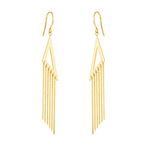 Open triangle and tassel earrings are made of polished 14kt yellow gold. Earring dimensions: 2 3/4in x 3/8in. French wire backs. Weight: 3.0 grams. Made in Turkey. Ships from USA.