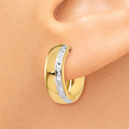 These small 14k two-tone gold huggie earrings have a polished finish with diamond-cut border. Diameter: 5/8in. Thickness: 6mm. Hinged hoops. Weight: 2.2 grams. Made in Turkey. Ships from USA.