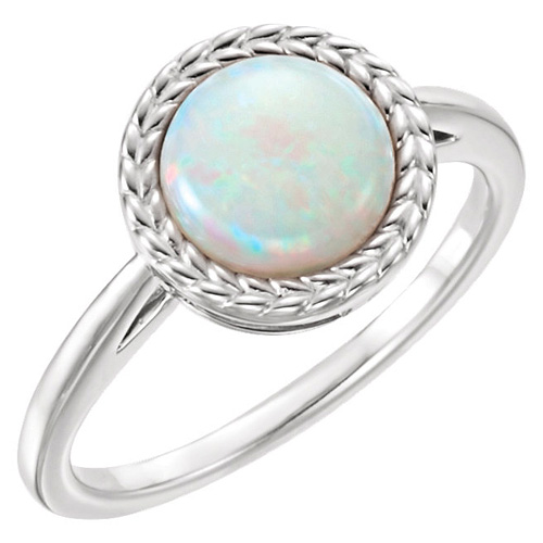 14kt white gold 1 ct round genuine cabochon opal ring has a leaf design. Round opal gemstone is 8mm x 8mm. Ring top width: 10.8mm. Ring palm width: 1.5mm. Item weight 3.5 grams. Made in the USA.