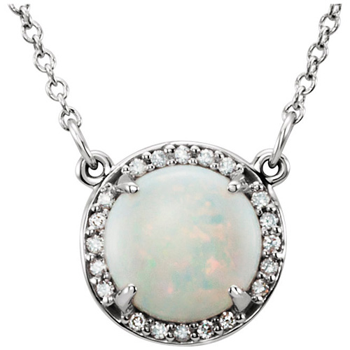 14kt white gold 1.0 ct opal 16in necklace has diamond accents around the center stone. 14kt white gold 16in cable chain with spring ring clasp. Opal details: 8mm round cabochon AAA quality. Diamond details: .05 carat total weight, 20 round full cut diamonds, G-H color, I1 clarity. Item weight 2.2 grams. Made in the USA.