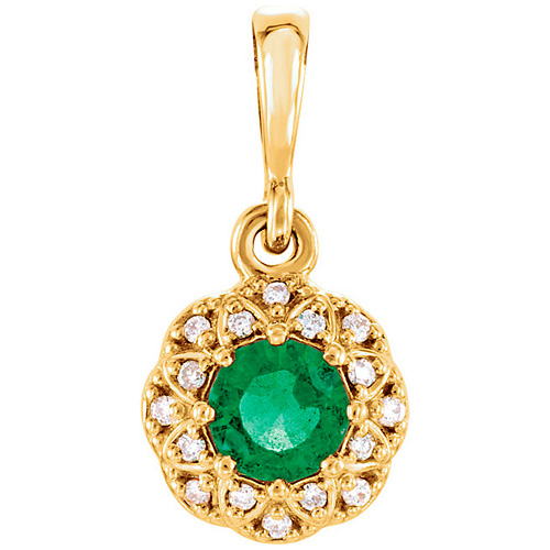 14kt yellow gold .25 ct emerald petite pendant has diamond accents around the center stone. Pendant size: 9.5mm x 9.5mm. Emerald details: 4mm round faceted, AA quality. Diamond details: .06 carat total weight, eight round full cut diamonds, G-H color, I1 clarity. Item weight: 1.0 gram. Fits up to a 2mm wide chain. Made in the USA.
