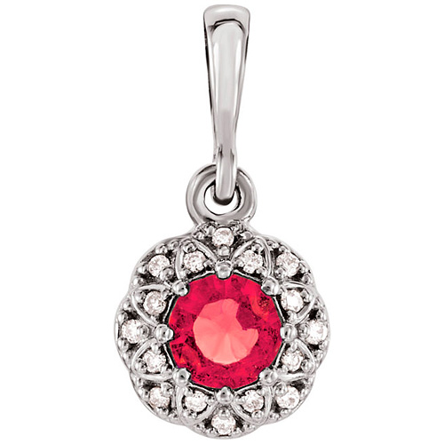 14kt white gold .33 ct ruby petite pendant has diamond accents around the center stone. Pendant size: 7.7mm x 7.5mm. Ruby details: 4mm round faceted, AA quality. Diamond details: .04 carat total weight, 16 round full cut diamonds, G-H color, I1 clarity. Item weight: 1.0 gram. Fits up to a 2mm wide chain. Made in the USA.