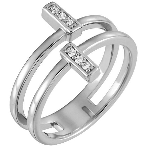 .06 ct tw diamond bar duo ring is made of polished 14kt white gold. Six round full cut diamonds, I1 clarity, G-H color. Ring top width: 6mm. Closed back, standard fit. Approximate weight: 5.3 grams. Made in the USA.