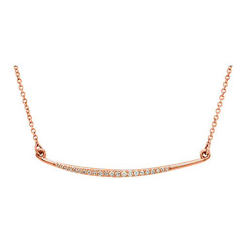 This solid 14k rose gold 1/8 ct tw diamond slightly curved bar pendant dangles from a matching 16in cable chain. Pendant width: 1 1/2in. Spring ring clasp. Chain width: 1mm. 22 round full cut diamonds. G-H color, I1 clarity. Weight: 2.2 grams.