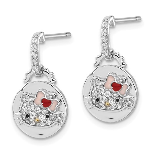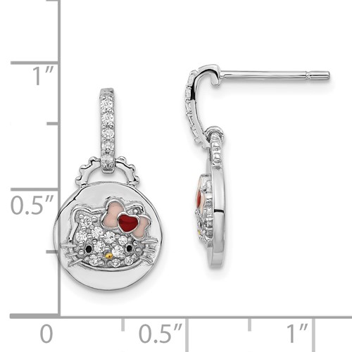 Sterling silver Hello Kitty round dangle post earrings feature an enameled Hello Kitty with clear Swarovski elements. Earring size: 3/4in x 3/8in. Gold-tone accent nose. Import.